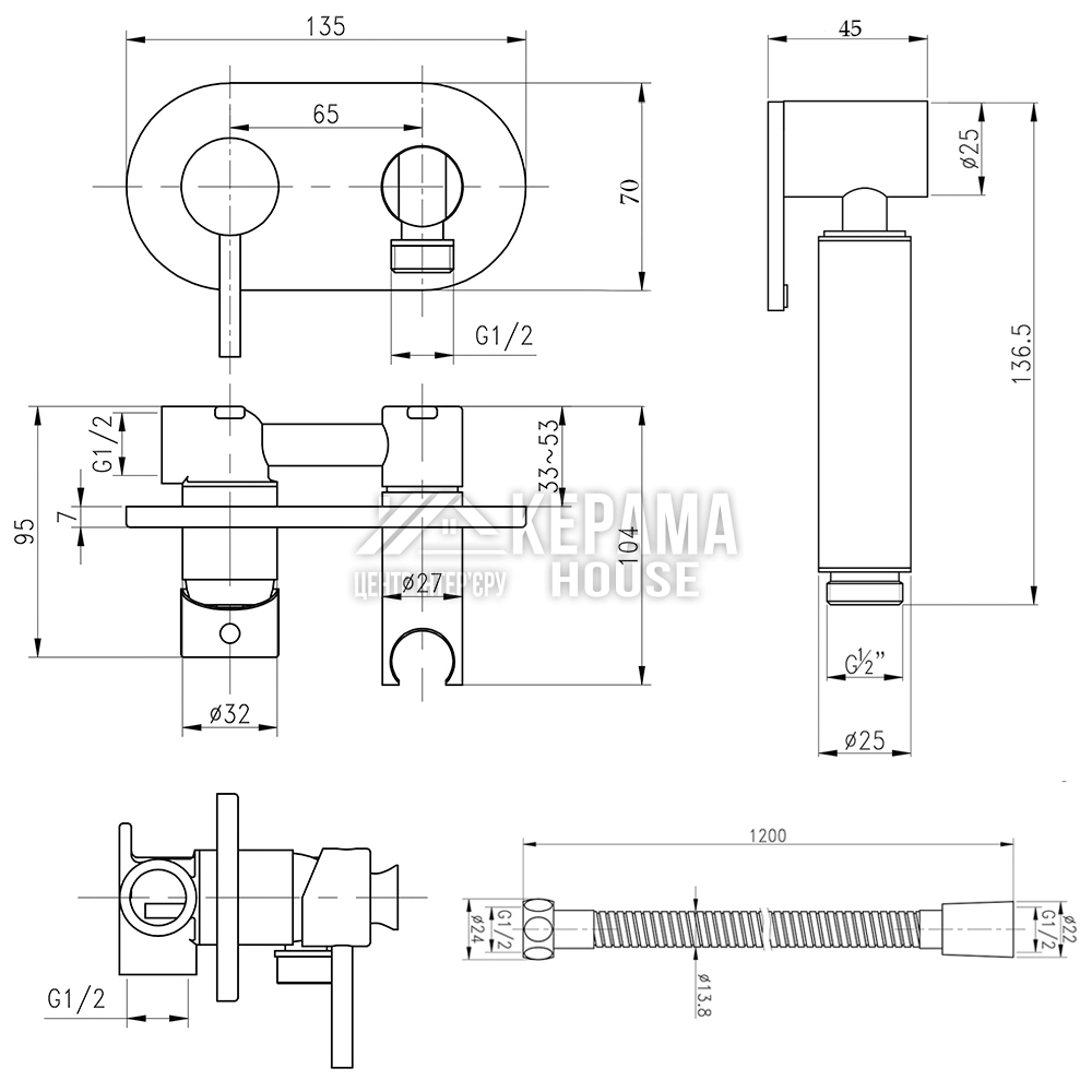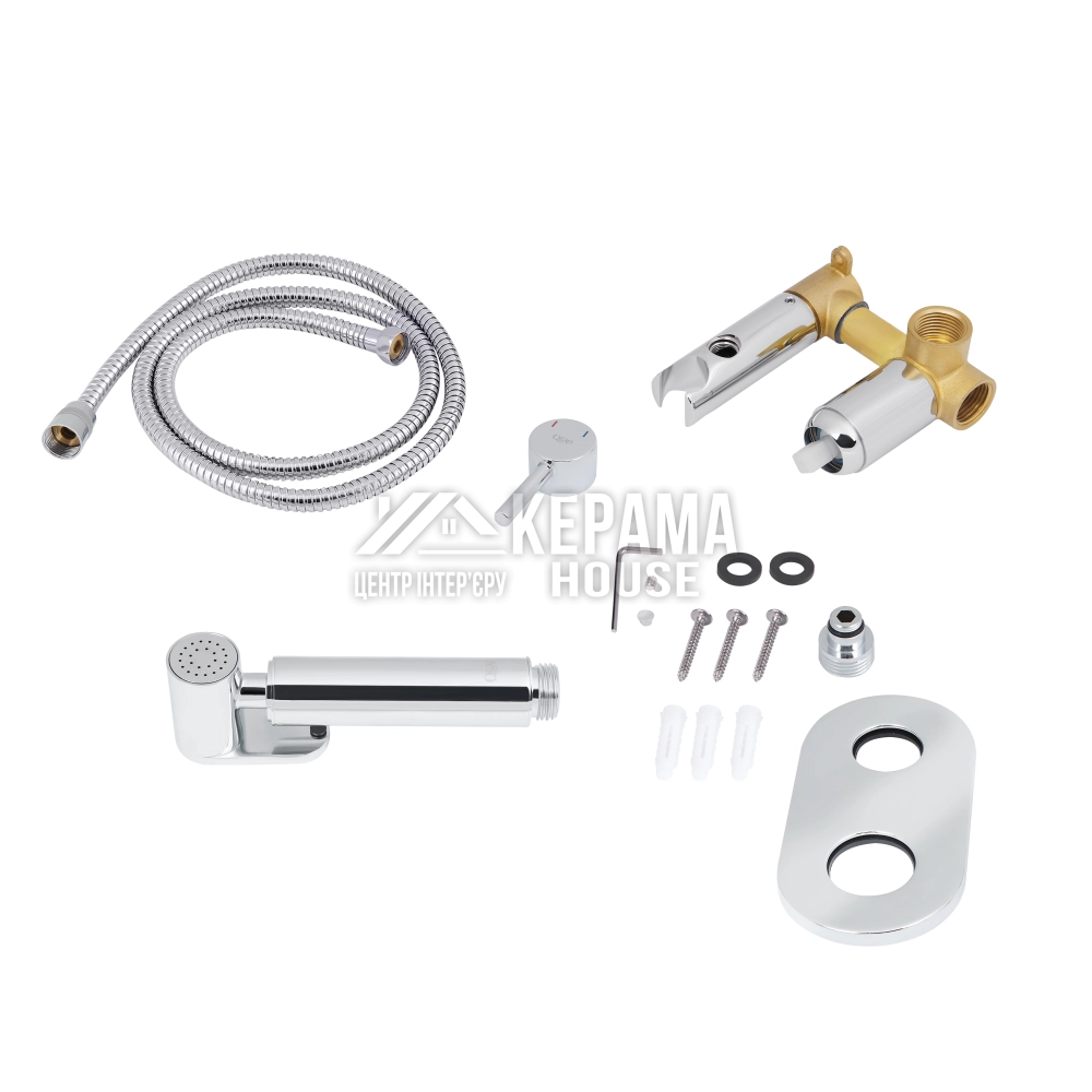 Лійка для гігієнічного душу, змішувач, душовий шланг, ключ, кріпильні деталі.