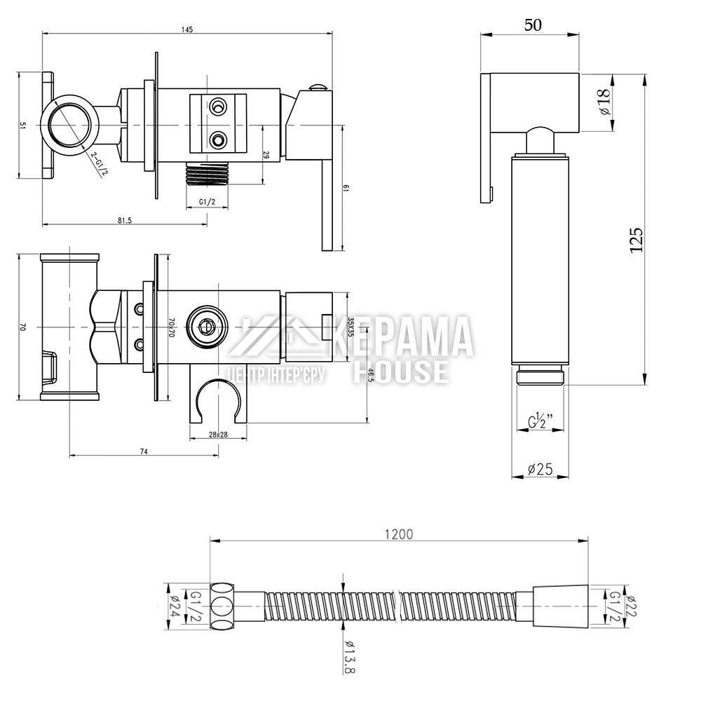 Лійка для гігієнічного душу, змішувач, шлангове під‘єднання, душовий шланг, ключ, кріпильні деталі.