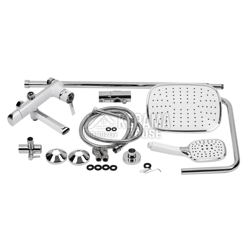 Змішувач, кронштейн для верхнього душу, лійка для верхнього душу, кронштейн для ручного душу, лійка для ручного душу, душовий шланг, душова стійка, кріпильні деталі.