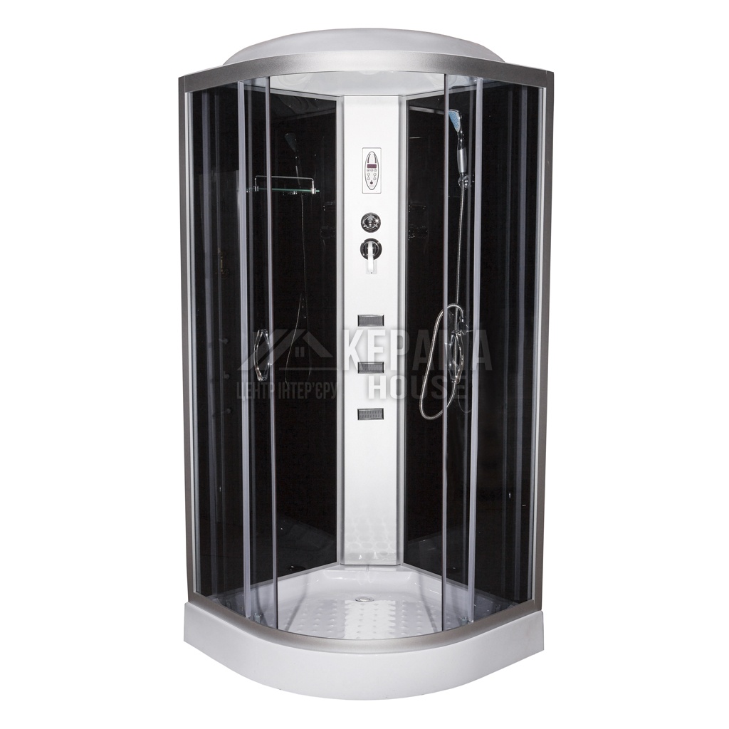 Душовий бокс 61 RC R напівкруглої форми, колір переднього скла - сірий, задніх - чорний. Скло удароміцне та загартоване в сірому тонованому відтінку. Масажний ефект зроблять 3 форсунки, розташовані вздовж гідробоксу, і великий верхній душ. У комплекті йде ручна лійка із зручним тримачем та кількома режимами потоків води. Перемикання та керування потоком води здійснюється стильним змішувачем.