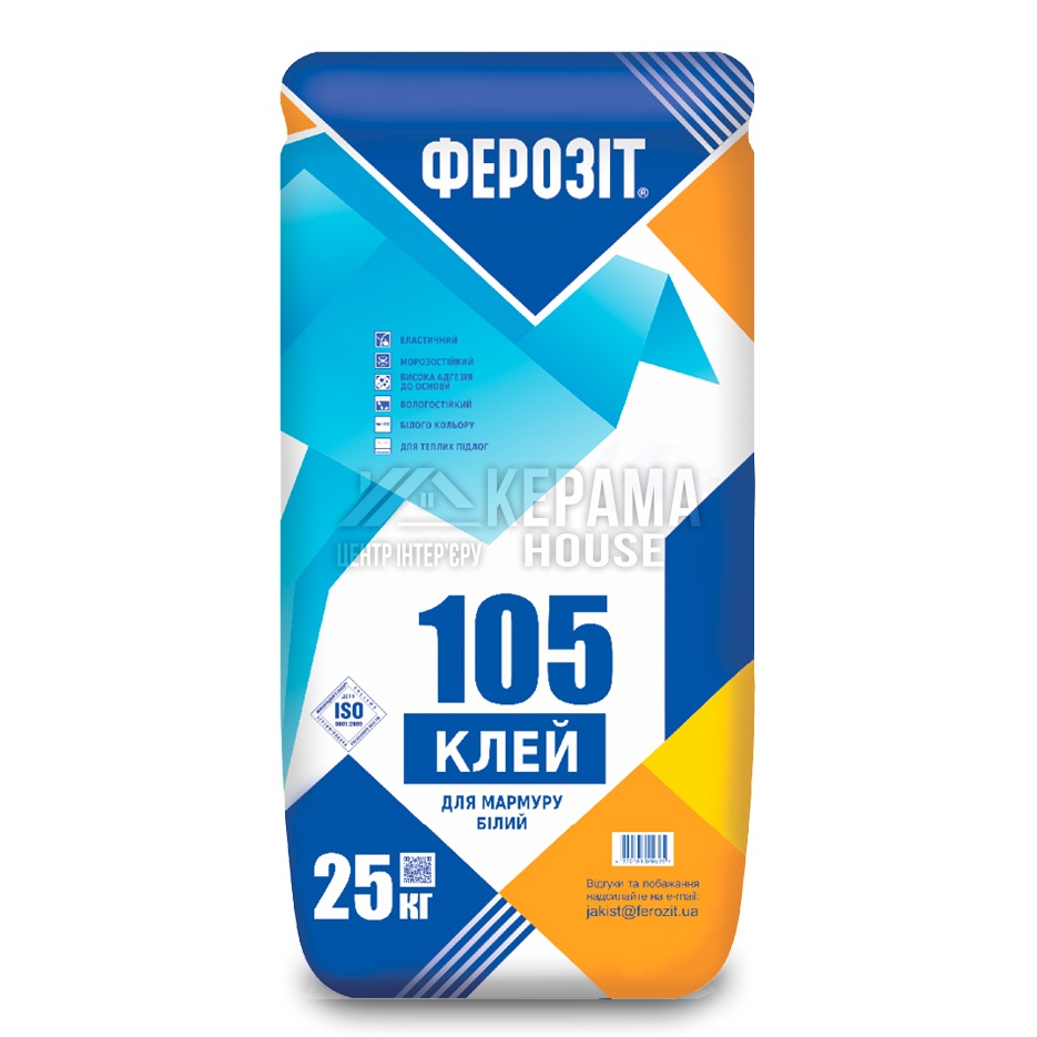 ФЕРОЗІТ 105 - клейова суха суміш з високоякісного білого цементу, використовується при оздоблювальних роботах на підлозі, стіні та будь-яких інших поверхнях. Підходить клей для плитки розміром не більше 40x40 см, а також для декоративного каменю, камінів, мармуру та теплої підлоги.