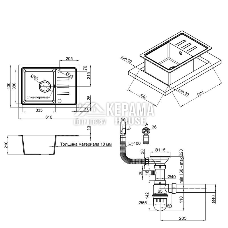 Мийка, сифон, кріпильні деталі.