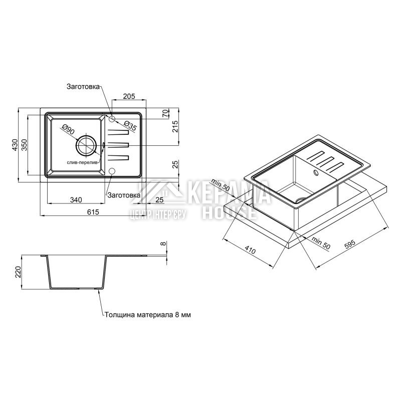 Мийка, сифон, зливник/перелив, кошиковий вентиль, кріпильні деталі.