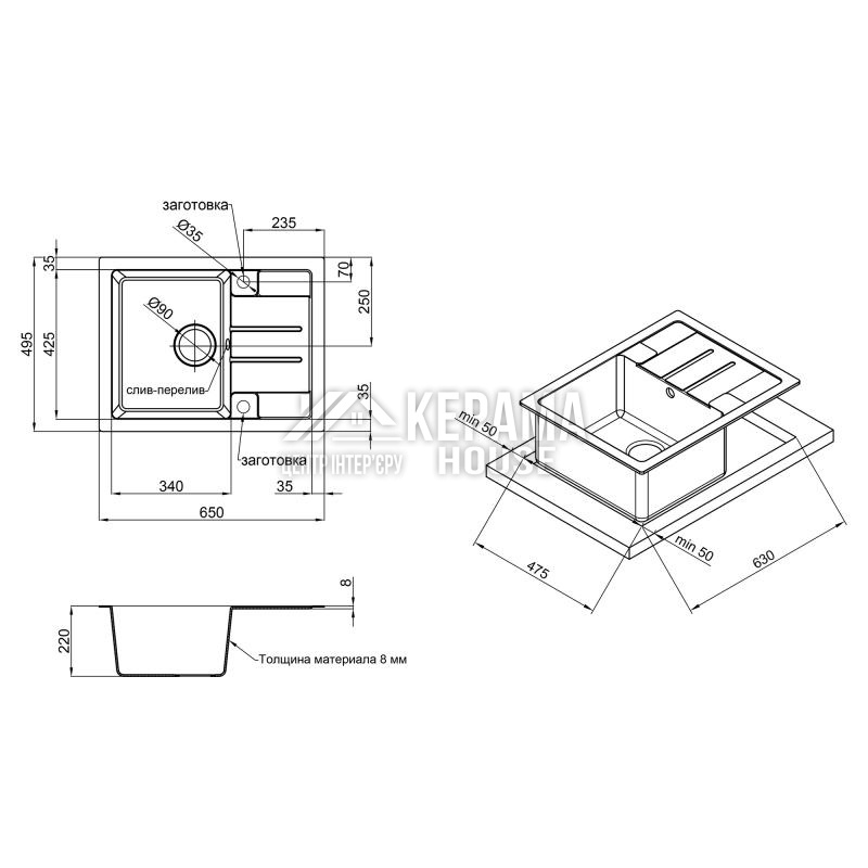 Мийка, сифон, зливник/перелив, кошиковий вентиль, кріпильні деталі.