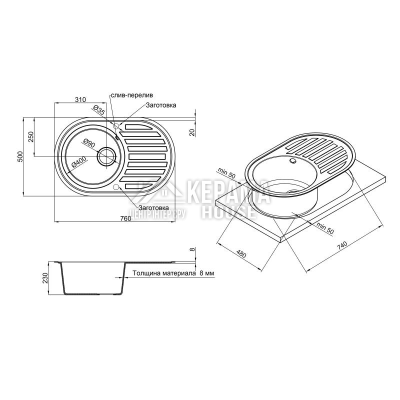 Мийка, сифон, зливник/перелив, кошиковий вентиль, кріпильні деталі.